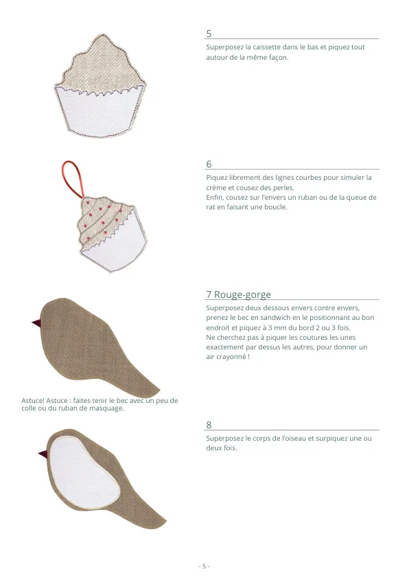 Vous pourrez confectionner : une boule de Noël pudding, un muffin / cupcake, une voiture portant un sapin de Noël et un rouge-gorge. Amusez-vous à les personnaliser avec des perles, des sequins…