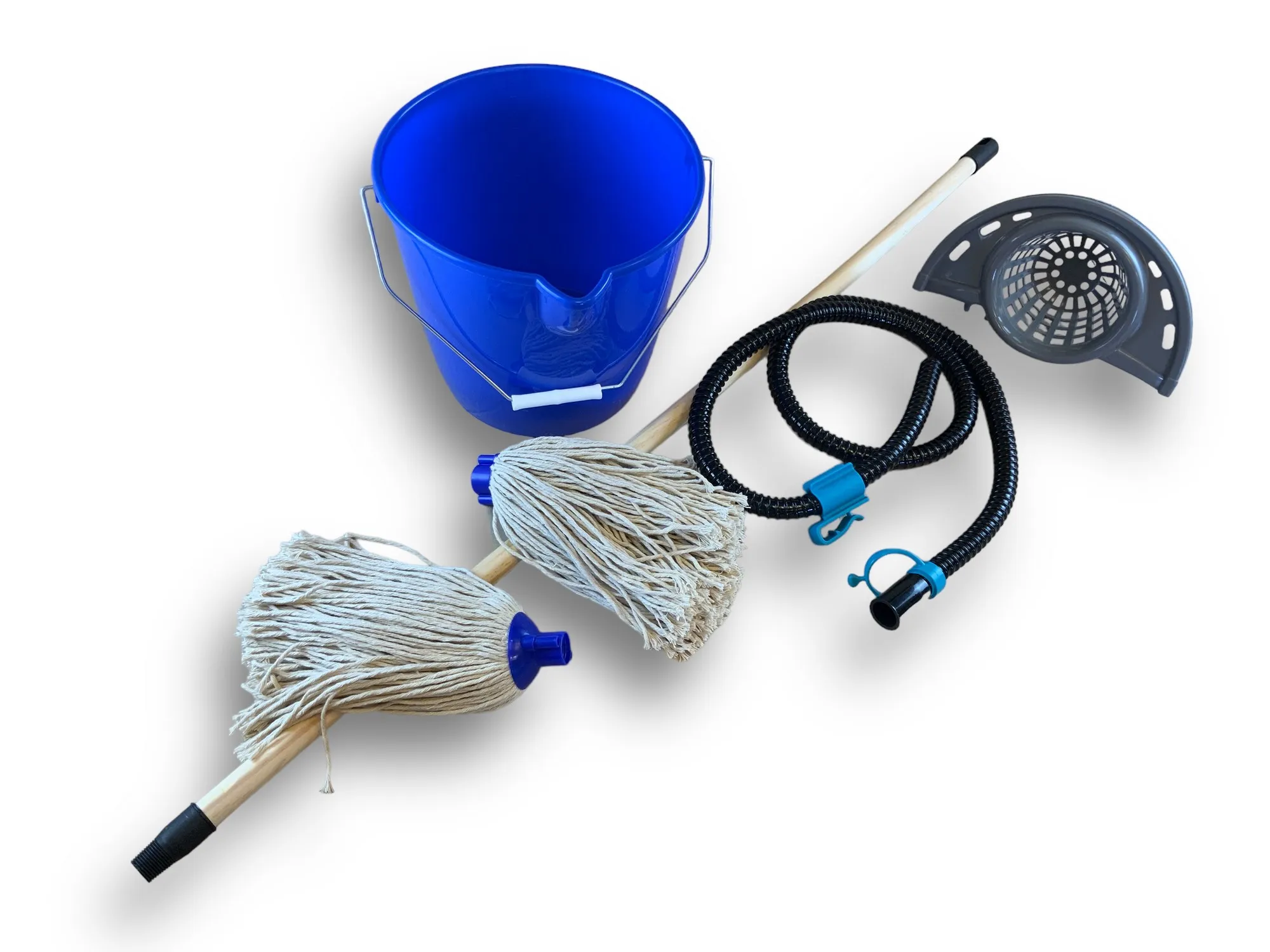 > L’ensemble de nettoyage comprend également un manche en bois d’une longueur de 1,40 m, un panier essoreur en plastique, et deux serpillières en coton à franges avec un tressage spécial pour une absorption optimale. Un kit complet pour un nettoyage en profondeur