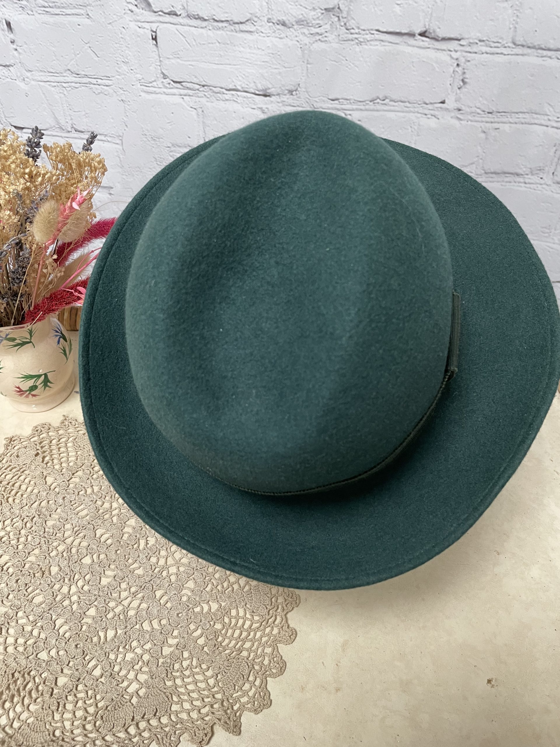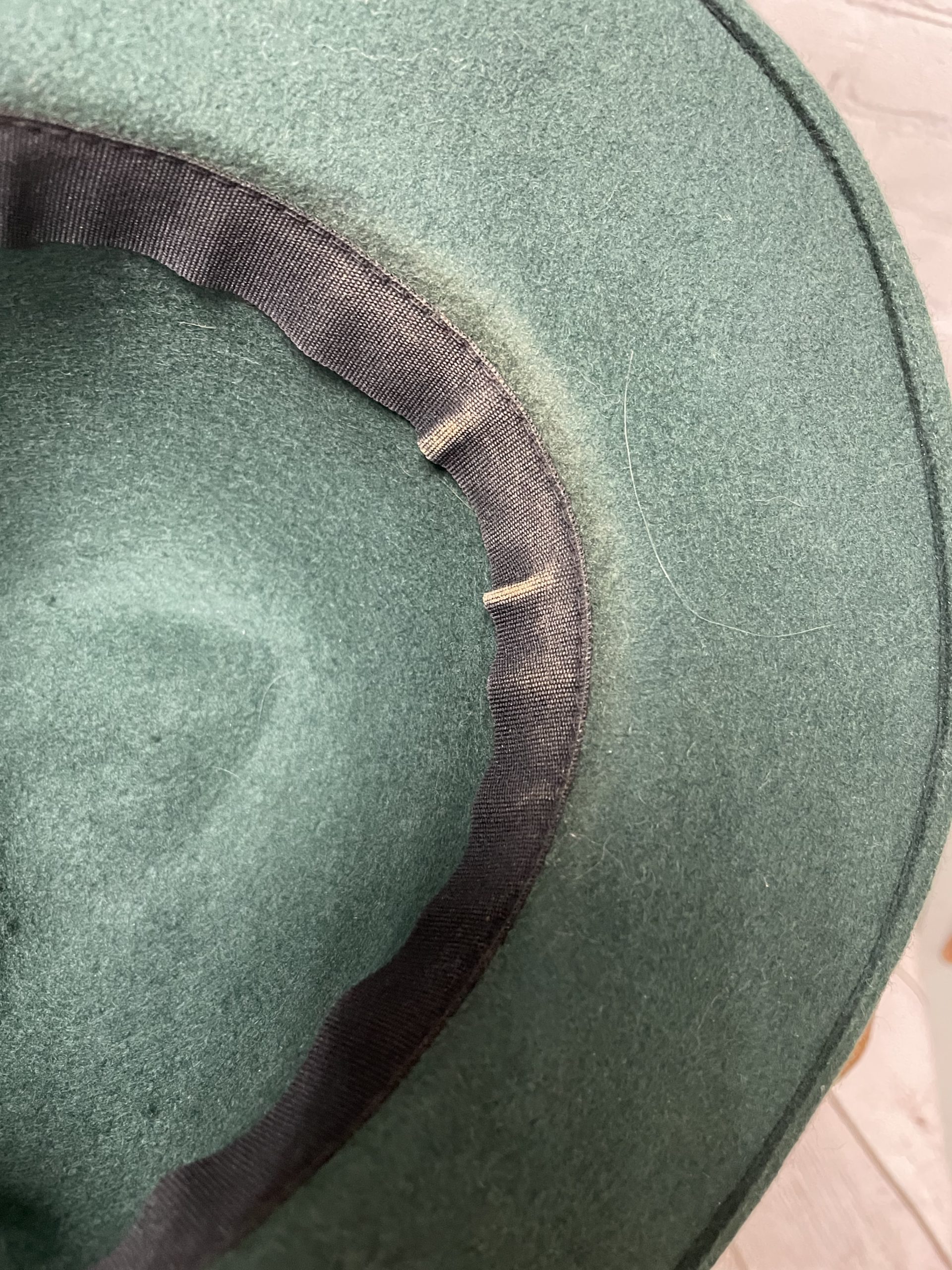 Amoureux de pièces vintage, on a des jolis accessoires à vous proposer comme ce chapeau vintage ! En feutre de couleur vert émeraude, ce joli chapeau de collection est signé du chapelier E. Werlé Paris établi depuis 1903. Décoré d’un ruban large de couleur vert kaki, le chapeau a une jolie forme ovale et ses bords sont repliés à l’arrière pour ajouter une silhouette élégante. En bon état général, ce chapeau élégant est une belle fabrication française !