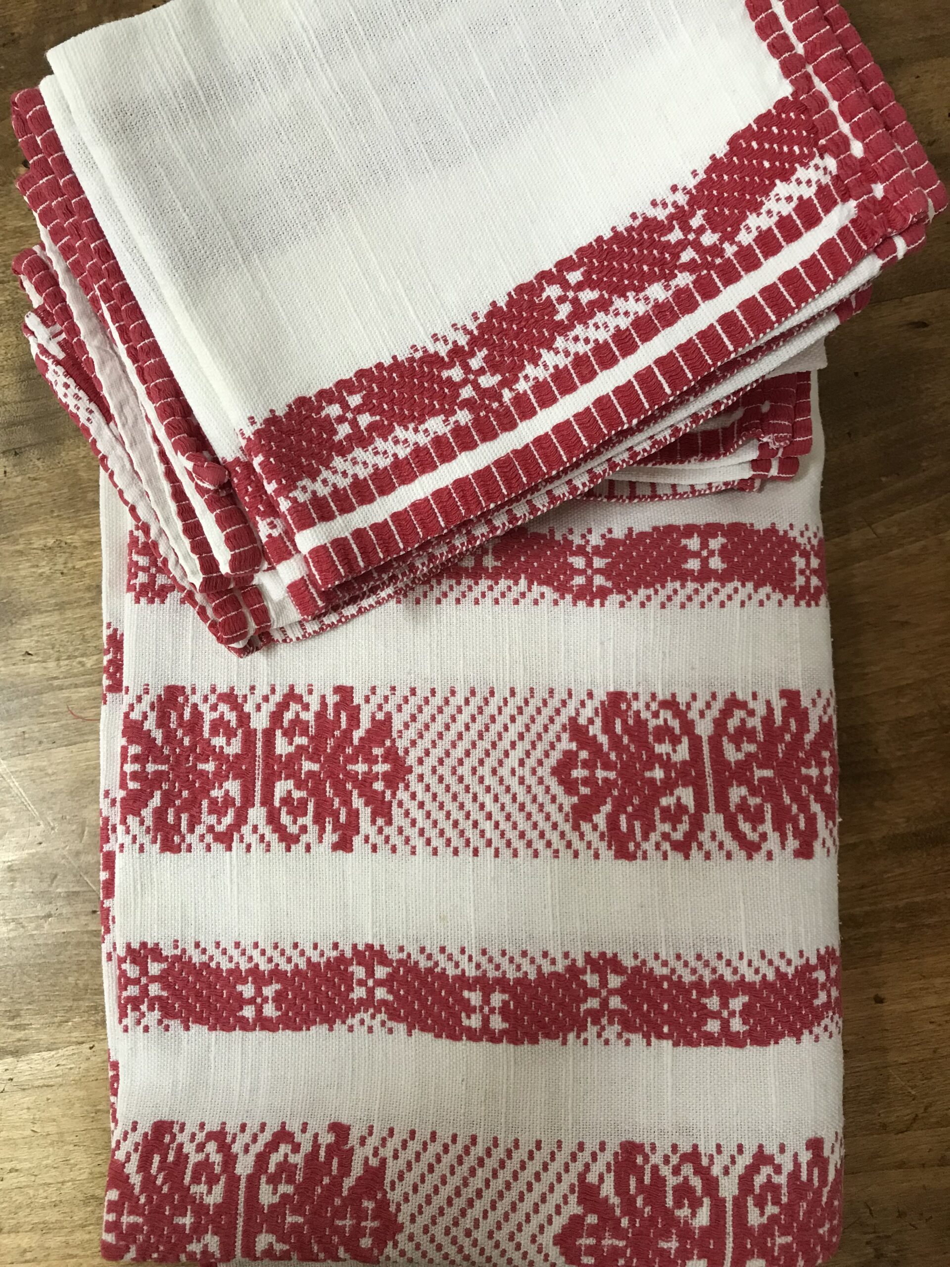 Alerte pépite !!!!! superbe ensemble nappe et serviette brodées, de couleur rouge et blanche. Magnifique lot, une nappe de forme ovale, avec au milieu en bandeau de la broderie traversante rouge aux motifs géométriques. La nappe mesure 2 m de longueur par 1,50 m de largeur. Cette nappe est accompagnée de 8 petites serviettes de table de taille 41 x 44 cm. Le tout est de couleur blanche avec broderie rouge. Une ou deux petites taches du au temps sont à prévoir mais rien de vraiment notable, l’ensemble est dans un très bon état. De quoi habiller vos tables pour de belles occasions.