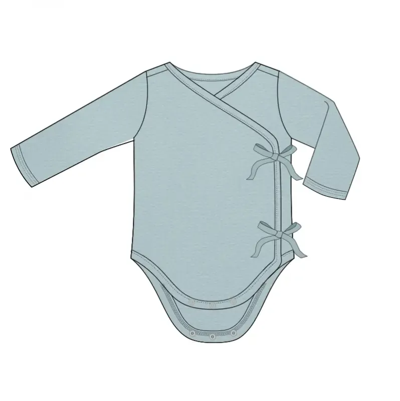 Grâce à ce patron body bébé, ajoutez une bordure colorée à ce body de type kimono (ou portefeuille) pour une version moderne et gaie. Ce body est pratique pour changer les couches facilement. On peut le fermer avec des petits liens en ruban ou alors avec des pressions au choix.