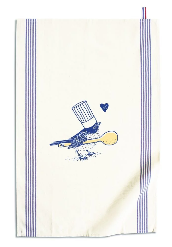 On craque pour la magnifique illustration de ce petit moineau une cuillère en bois dans le bec, dans les tons de bleu sur fond blanc.