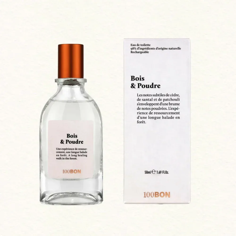 Découvrez parmi les Eaux de toilette naturelles et éthiques de la marque lyonnaise 100BON, la senteur Bois et Poudre : : les notes subtiles de cèdre, de santal et de patchouli s’enveloppent d’une brume de notes poudrées.